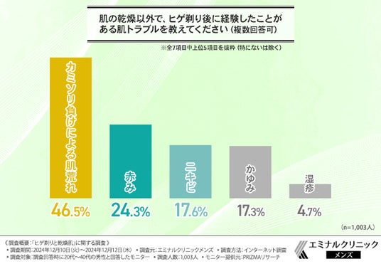 『カミソリ負けによる肌荒れ(46.5%)』と回答した方が最も多く、