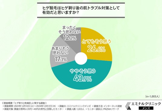 さらに、「ヒゲ脱毛はヒゲ剃り後の肌トラブル対策として有効だと思いますか?」と質問したところ、7割以上の方が