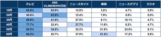「普段、ニュースはどのような媒体でご覧になっていますか?(複数選択可)」と質問したところ、年代別の男女で以下のような回答結果になりました。