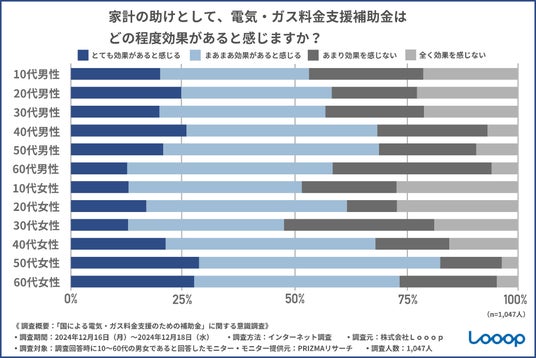 続いて、「家計の助けとして、電気・ガス料金支援補助金はどの程度効果があると感じますか?」と質問したところ、年代別の男女で以下のような回答結果になりました。