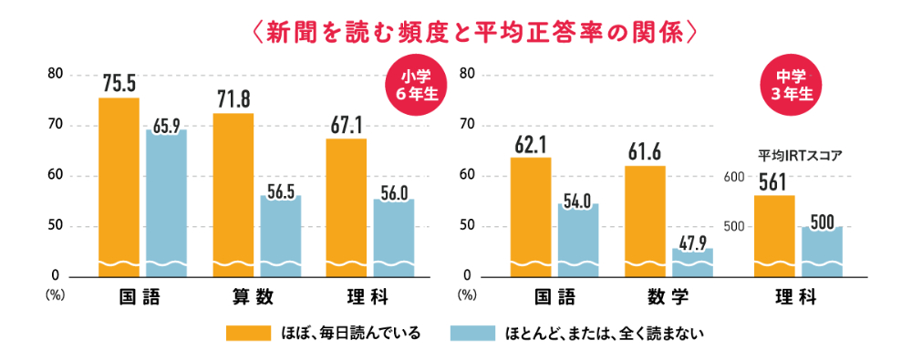 新聞を読む頻度が増えるにつれ、調査対象の全教科で平均正答率が向上する相関関係が見られました。