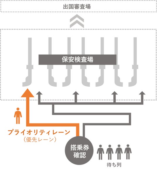<プライオリティレーン>主にファーストクラス、ビジネスクラスを利用するお客さまやお手伝いが必要なお客さまが、優先的に保安検査を受けることができるプライオリティレーンを導入します。