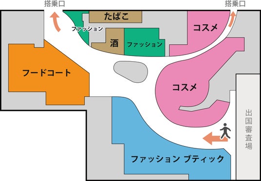 免税店エリアを約4倍(約6,000平方メートル )に増床し、ファッション、コスメ、お酒などの取扱商品を大幅に拡充します。また、旅客動線上に免税店を配置したウォークスルー型店舗となることで、出国審査を受けた後、移動しながら免税ショッピングをお楽しみいただけます。