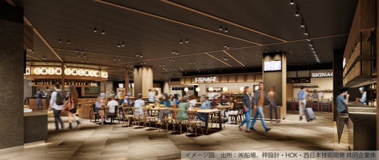 - 出国審査場を通過したエリアには、従来の約4倍の広さとなる免税店や8店舗が入るフードコート※を展開し、ショッピングや食事を楽しく快適に過ごせる空間を提供します。ウォークスルー型の免税店の中央にはランドマークとなる櫓を設け、日本を出発する最後まで福岡らしさ・日本らしさを感じられます。また、入国時にもお得に免税ショッピングをお楽しみいただける到着免税店をオープンします。
