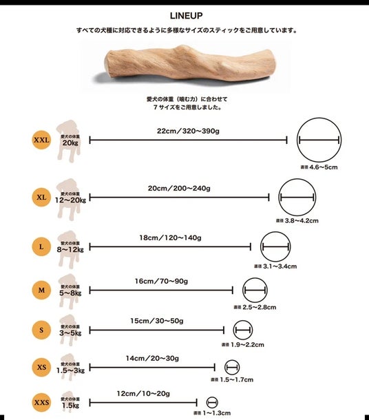 すべての犬種に対応できるように多様なサイズのスティックをご用意しています。