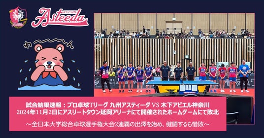 Tリーグ所属プロ卓球チーム「九州アスティーダ」を運営する「九州アスティーダ株式会社」(所在地:福岡県大野城市、代表取締役 川面 創 以下、当チームおよび、当社)は、2024年11月2日にアスリートタウン延岡アリーナにて開催されたホームマッチにて、0 - 4 で敗北したことをお知らせします。