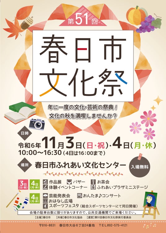 春日市民でつくる、春日市民のための文化・芸術の祭典「春日市文化祭」を開催します。市民の皆さんによる作品展示や、芸能発表会をはじめ、市民団体やプロの音楽家によるステージなど、さまざまな催しを開催します。