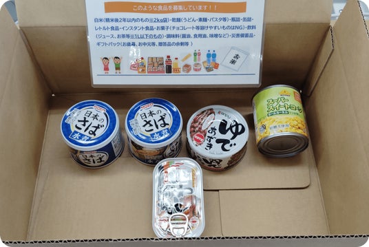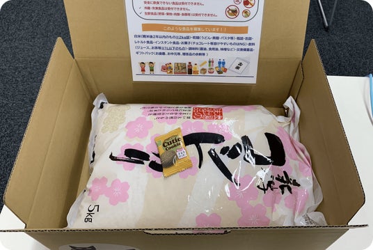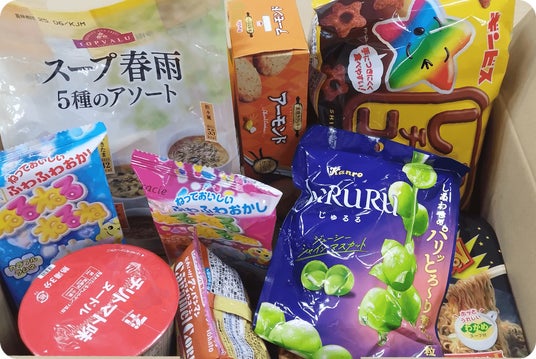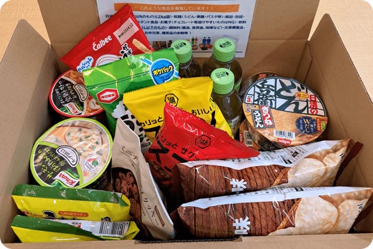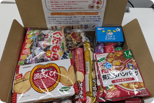 お米(5kg)、お菓子(ポテトチップス・チョコレート・クッキー・飴など)、インスタント食品(うどん・ラーメン・焼きそば・スープ春雨・スープパスタなど)、レトルト食品(煮込みハンバーグなど)、缶詰(あずき缶・鯖缶・スイートコーンなど)、飲料(お茶)