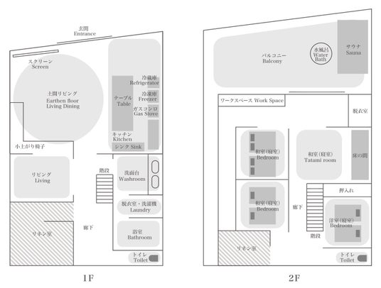6LDK(土間リビング、リビング、キッチン、ダイニング、寝室4室(和室3、洋室1)、トイレ2ヶ所、ワークスペース)