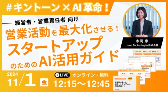 新人からトップセールスを輩出するコネクテッドセールス・プラットフォーム*「Front Agent」を開発・提供するUmee Technologies株式会社(本社:東京都調布市、代表取締役:新納 弘崇、以下「ユミー」)は、11月24日(金)12:15~12:45にオンラインセミナー「キントーン×AIで営業活動を最大化させる!スタートアップのためのAI活用ガイド」を開催いたします。