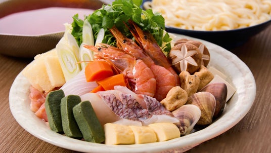 ◇有頭海老 ◇鯛 ◇蛤 ◇鶏肉 ◇白ねぎ ◇椎茸 ◇白菜 ◇松山揚げ ◇くずきり ◇人参煮 ◇三つ葉 ◇豆腐 ◇湯葉揚げ ◇生麩 ◇ひろうす
