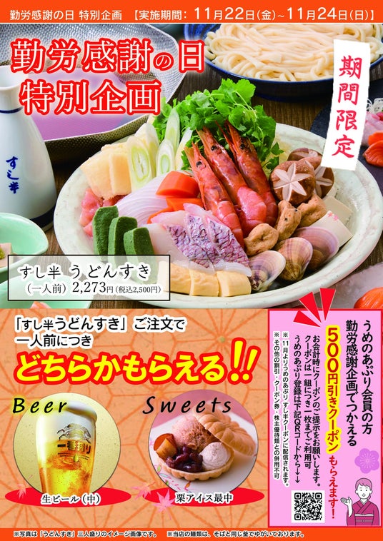 株式会社梅の花すし半名物 うどんすきをご注文の方にお得なサービスを実施いたします!