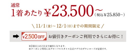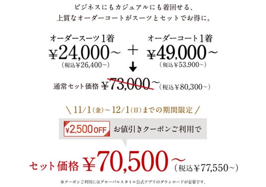 オーダースーツ専門店「グローバルスタイル」を運営するグローバルスタイル株式会社(東京証券取引所 スタンダード市場:7126、本社:大阪市中央区、代表取締役社長 田城弘志)は、11月1日 (金)から12月1日(日)までの期間中、対象プランご利用で、オーダースーツ2着¥45,500~(税込¥50,050~)になるフェアを全39店舗で開催いたします。