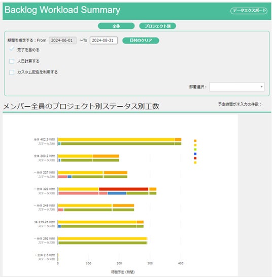 そこで、ヌーラボ公式パートナー であるオープントーン社の「Backlog助っ人サービス」を紹介されたことで導入を検討、Backlog上のデータから、業務の実態を数値化・グラフ化の実装に至りました。導入後、部員からは「ほかのメンバーとの共有が容易で業務平準化に役立ちそう」、「プロジェクトやステータスごとの稼働時間が見られるのが便利」といった反応がありました。