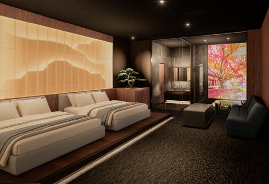 ホテルは、ダブルルーム・ツインルームの2種類をご提供します。日本人の精神性や敬いの心を体現した客室には、ベッドから見渡せる構造の浴室を設計。壁面に日本の信仰や原風景のアートワークを投影。檜葉の浴槽には木の香りが漂い、五感で自然に宿る命を感じながら眠りにつくことができます。「Giraffe Tenjin 常」では、ホテル&サウナ合わせての「ととのい」をご提供します。