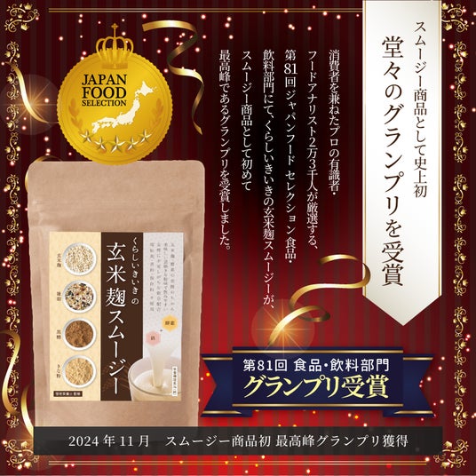 くらしいきいき株式会社くらしいきいき株式会社(福岡県福岡市、代表取締役:掛江一也)の『玄米麹スムージー』が、第81回ジャパン・フード・セレクションにおいてスムージーとしては初めて、最高賞であるグランプリを受賞いたしました。