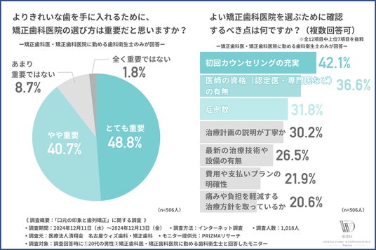 また、矯正歯科医・矯正歯科医院に勤める歯科衛生士は、きれいな歯を手に入れる上で矯正歯科医院の選択が重要と認識しており、特に初回カウンセリングの充実や医師の資格が大切な要素として挙げられています。