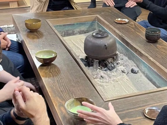 囲炉裏または椅子とテーブルの空間のどちらかお好きな場所でお菓子とともにお抹茶を一服