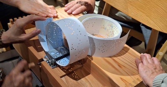 ハンドリングW-faceオルゴールは、穴をあけた紙をセットし、ハンドルを回すことで音楽を奏でる手回し式オルゴールです。