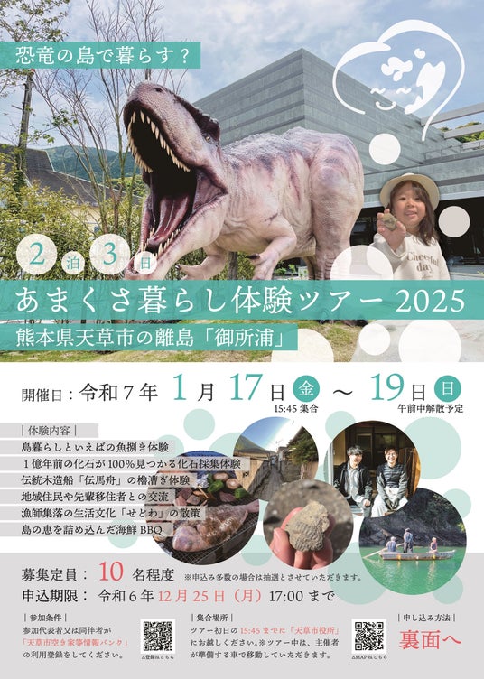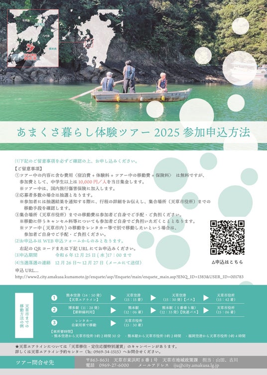 12月25日(水)午後5時までに「天草市空き家等情報バンク」の利用登録をしたうえで、WEB申込フォームにて体験ツアーの申し込みが別途必要となりますので、以下「詳細を見る」のリンク先をご確認ください