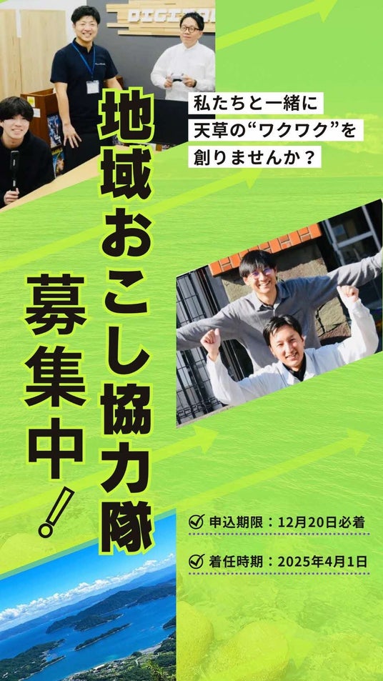 引き続き、地域おこし協力隊員の「地域協力活動」を通した隊員×地域×天草市の「三方よし」の取組みを促進するため、令和6年12月20日(金)までの期間、令和7年4月1日採用の地域おこし協力隊員2名を下表のとおり募集しています。