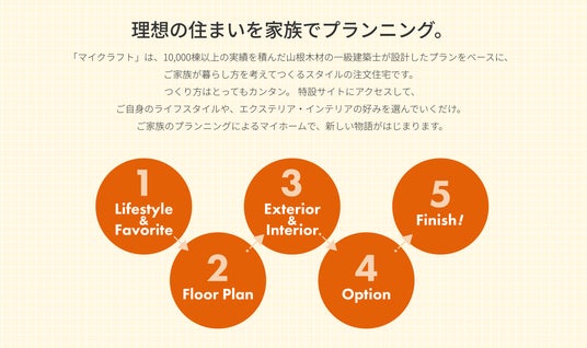My Craftのプランニングサイトでは山根木材が考える4つのライフスタイルやこだわり条件から簡単にお住まいの企画ができます。是非ご家族で将来の暮らしをイメージしながら住まいづくりの楽しさをご体感ください。