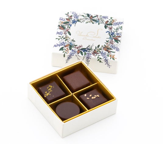 内容:チョコレート4個入(ピスターシュ、ミルフィーユ、ロイヤルティーヌ、セサミ)