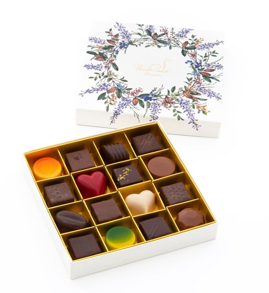 「ヤスシササキ」2025年日本展開ラインナップ22種のうち、16種を詰め合わせたスペシャルアソートです。すべてベルギーのアトリエで作られたチョコレートです。