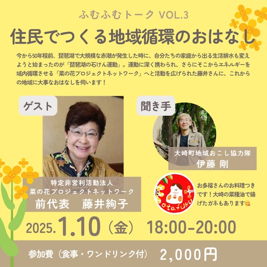 合同会社うつろひ(鹿児島県・大崎町:代表社員 藤田香澄)は、鹿児島県大崎町にて運営を行う、コワーキングと夜カフェを兼ねたコミュニティカフェ「ふむふむ」において、特定非営利活動法人 菜の花プロジェクトネットワーク前代表 藤井絢子氏をお招きしたトークイベントを2025年1月10日(金)に開催致します。