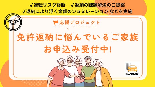セーフライド株式会社(本社:福岡県福岡市、代表取締役:山内紗衣)は、福岡県にて、大切なご家族の免許返納を伴走支援型で応援するキャンペーンを2024年12月25日より募集開始しました。ご家族と高齢者が安心、納得した上で免許返納につながるように計画をしています。