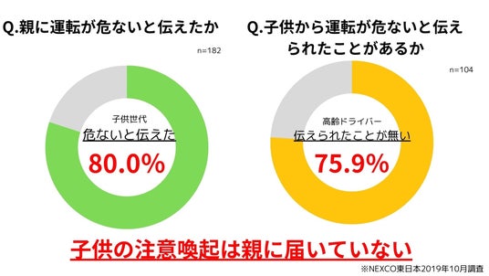 近年免許返納の必要性が叫ばれる中、70歳以上の高齢者ドライバーを親に持つ子供世代の約44%が免許返納をさせたいと考えています(※1)。しかし、『言いづらい』『言ったが聞いてくれない』『喧嘩になる』などの問題を抱えています。事実、子供世代の80%が運転が危ないと伝えても、高齢者ドライバーの75.9%が伝えられたことが無いと、子供の注意喚起が親に届いていない現状もあるのです。(※2)