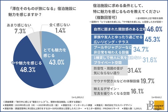 また、「理想の宿泊施設の過ごし方」では、半数以上が「日中は外で活動し、夜は宿で休みたい」と答え、宿泊施設を“休息の場”として重視している様子が見られました。一方、「宿泊施設そのものを楽しみたい」とする層も2割近く存在し、宿泊施設が旅の中心になるケースもあることがわかりました。「滞在そのものが旅になる宿泊施設」に魅力を感じる方も9割を超えており、宿泊施設は単なる拠点から旅の満足度を決定づける存在へと変わりつつあるのではないでしょうか。