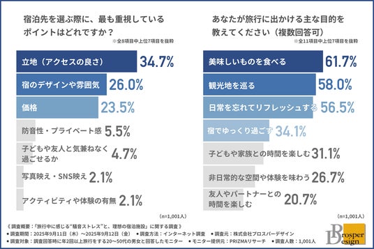 宿泊先選びでは「立地」「雰囲気」「価格」が重視するポイントの上位を占める結果となりました。また、旅行の目的として「宿でゆっくり過ごす」と答えた方は3割を超え、“動く旅”だけでなく“とどまる旅”への関心も広がっている可能性があります。