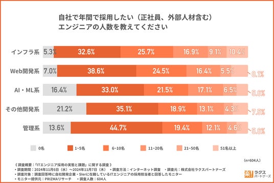 IT・WEBサービスの高度化、さらに労働人口の減少や働き方改革などの影響により、エンジニア不足は深刻な問題となっていますが、実際どれくらいの人数の採用を考えているのでしょうか?