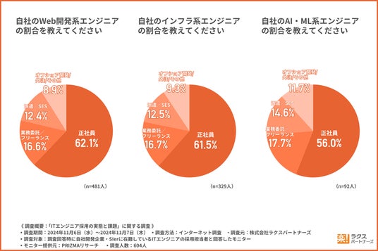 ・自社のエンジニアの契約形態の構成割合を調査。正社員比率は6割程度。