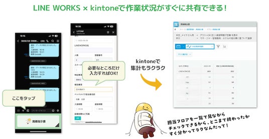 現場担当者はLINE WORKS上で必要なところだけ入力⇒管理部門はkintoneで集計もラクラク