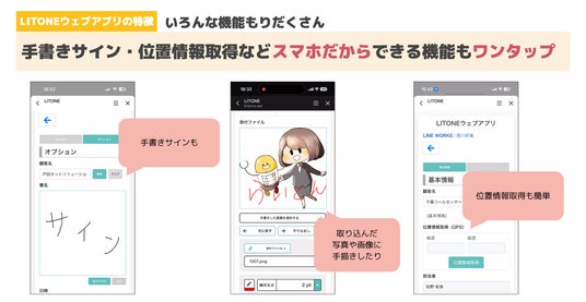 「LITONEウェブアプリ for LINE WORKS」は、LINE WORKSのトーク画面からそのまま操作でき、二次元コード読み取り・GPS・手書きサインなど現場業務に最適化された機能を搭載。 だれでも使える操作性で、げんばDXをもっと身近にします。