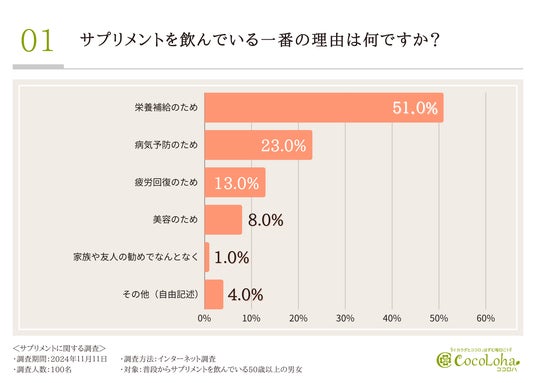 「栄養補給のため(51.0%)」「病気予防のため(23.0%)」という回答が多く集まり、健康面を考慮し不足しがちな栄養素を補給しようとしている方が多いことがわかりました。