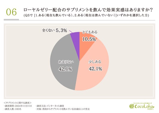 次に、先ほどの調査でローヤルゼリーを飲んだ方に対して、ローヤルゼリー配合のサプリメントを飲んで効果実感はあるか伺ったところ、