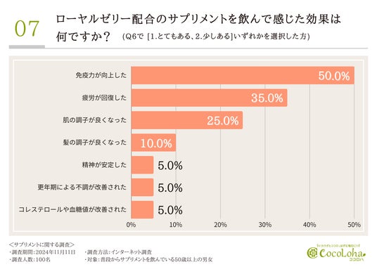 「免疫力が向上した(50.0%)」「疲労が回復した(35.0%)」「肌の調子が良くなった(25.0%)」という回答が集まりました。