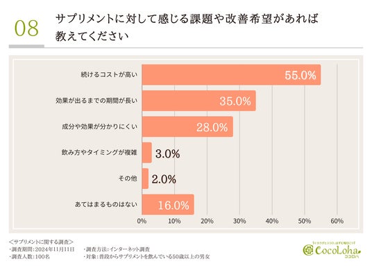 「続けるコストが高い(55.0%)」「効果が出るまでの期間が長い(35.0%)」「成分や効果が分かりにくい(28.0%)」という回答が集まりました。
