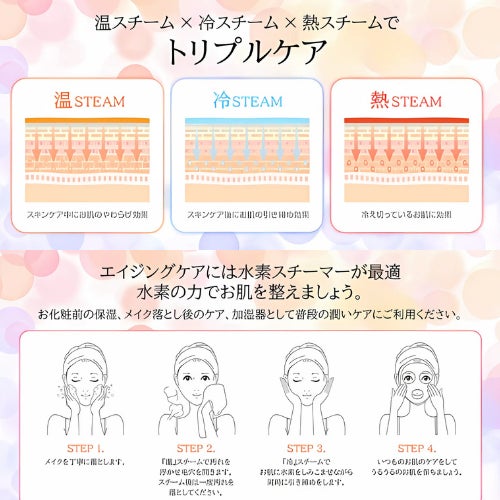 肌の保湿: 水素スチームが毛穴の奥まで浸透し、乾燥から守ります。特に冷暖房が効いた室内や冬の乾燥した時期に最適です。