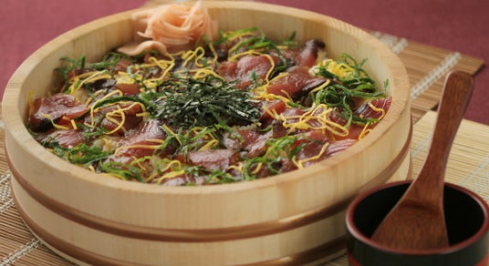 漁師が漁に出て獲れた魚を船場でさばいて、手で混ぜあわせたことから「てこねずし」と呼ばれ、伊勢志摩地域の郷土料理となっています。カツオやマグロなどの赤身を刺身にして、醤油などで作ったタレに付け込んだものを酢飯の上に並べて作ります。