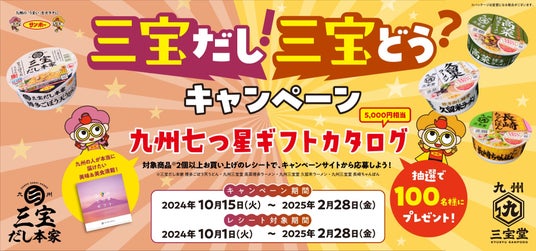 サンポー食品株式会社『九州七つ星ギフトカタログ(5,000円相当)』が抽選で100名様、さらにXではクイズに答えて合計150名様に『三宝だし本家&九州三宝堂お試しセット』が当たるキャンペーンを開催!