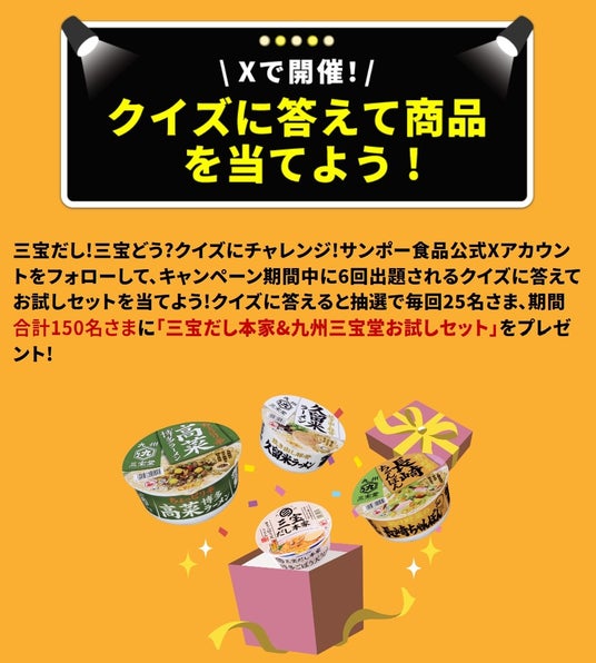 サンポ―食品公式Xアカウントをフォローして、キャンペーン期間中に6回出題されるクイズに答えると、抽選で各回25名様、期間合計150名様に『三宝だし本家&九州三宝堂おためしセット』をプレゼントいたします。