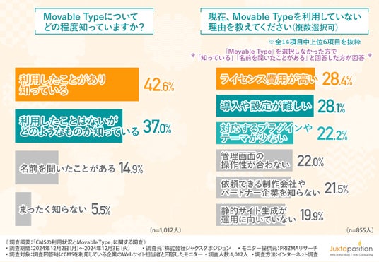 株式会社ジャクスタポジション(本社所在地:札幌市中央区、代表取締役:西山 泰史)は、CMSを利用している企業のWebサイト担当者を対象に、「CMSの利用状況とMovable Type」に関する調査を実施しました。
