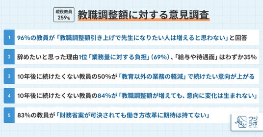 教育のオープン化をミッションに教員向け支援サービスを展開する株式会社クジラボ(本社:福岡県福岡市、代表取締役:森實 泰司、以下「クジラボ」)は、全国20代~60代の小学校・中学校・高校・特別支援学校の現役教員259名の教員を対象に、教職調整額*1 引き上げ案に対する定量調査を実施しました。