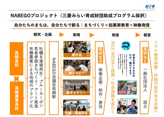 株式会社イツノマ(宮崎県都農町、代表取締役:中川敬文)は、三菱みらい育成財団の助成を受け、高鍋高校・高鍋農業高校の生徒が主体となり、地域課題やまちづくりを発信する新メディア『ナベゴーメディア』を開設します。本プロジェクトは、RICEメディア(株式会社TomoshiBito)と連携し、「自分たちのまちは自分たちで創る」挑戦を動画で全国に届け、高校生が地域を動かす新しいモデルを目指すものです。