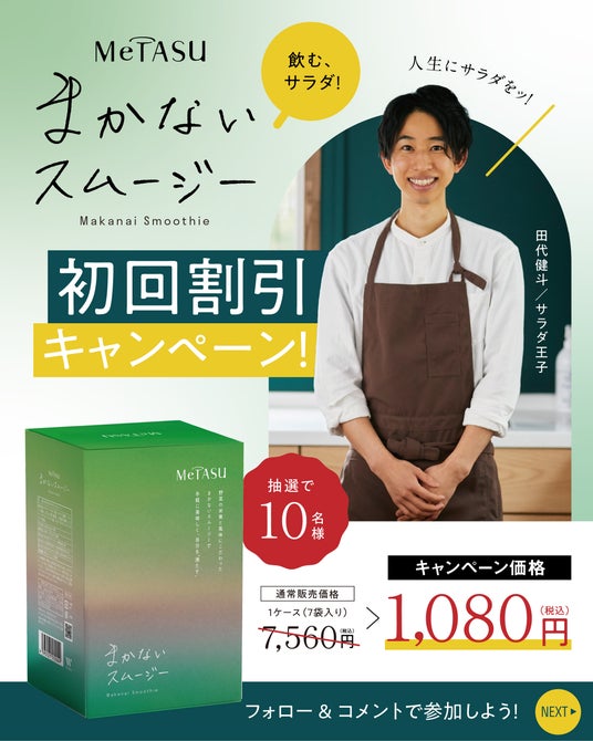 「いいネタつくります。コント」を掲げ、ブランディングからクリエイティブ、そしてプロモーションまでをワンストップで手掛ける大分県のデザイン会社、株式会社Cont(本社:大分県大分市、代表取締役:河野 智洋)は、Instagramフォロワー数11万人超、KADOKAWAより自身初となる書籍も出版したサラダ王子こと、田代健斗氏をブランドプロデューサーに招聘し、田代健斗オリジナルブランド『MeTASU』から発売した『まかないスムージー』がお得に購入できるキャンペーンを、12月2日(月)から12月8日(日)までの期間、開催いたします。