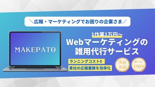 MAKEPATOはマーケティングパートナーの略称で、WEB業務や広報業務の雑務を代行するサービスです。特に広報やマーケティングにおける『急なタスク』や『外注するほどではない小規模なタスク』に対応し、これまでの外注に伴う多大なコストや手間の課題を解消する画期的な仕組みを実現しました。